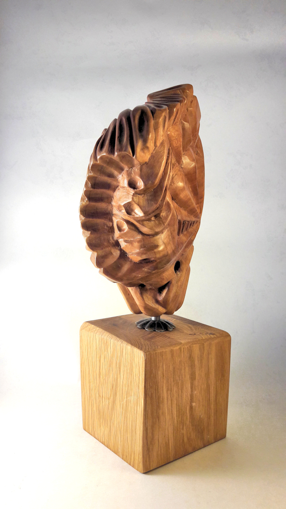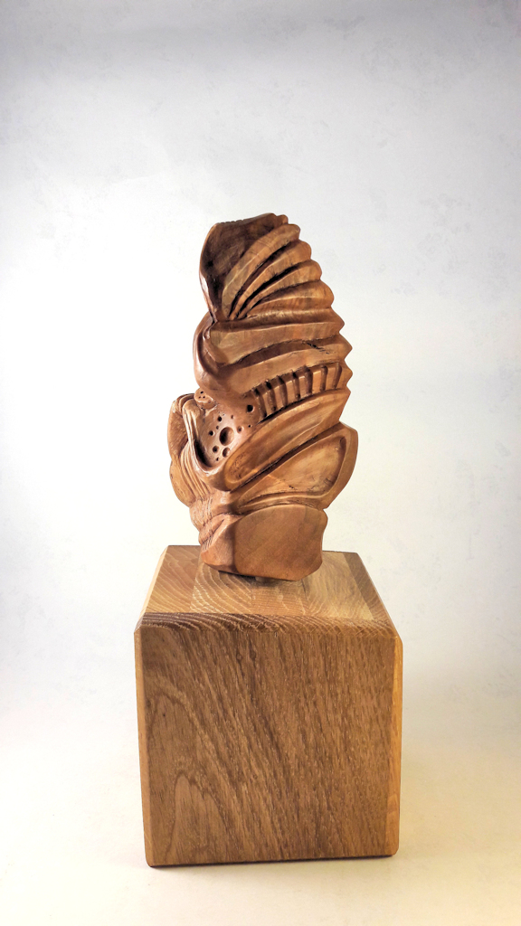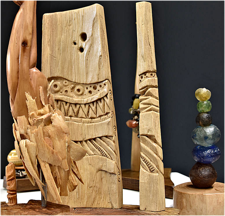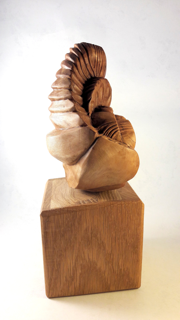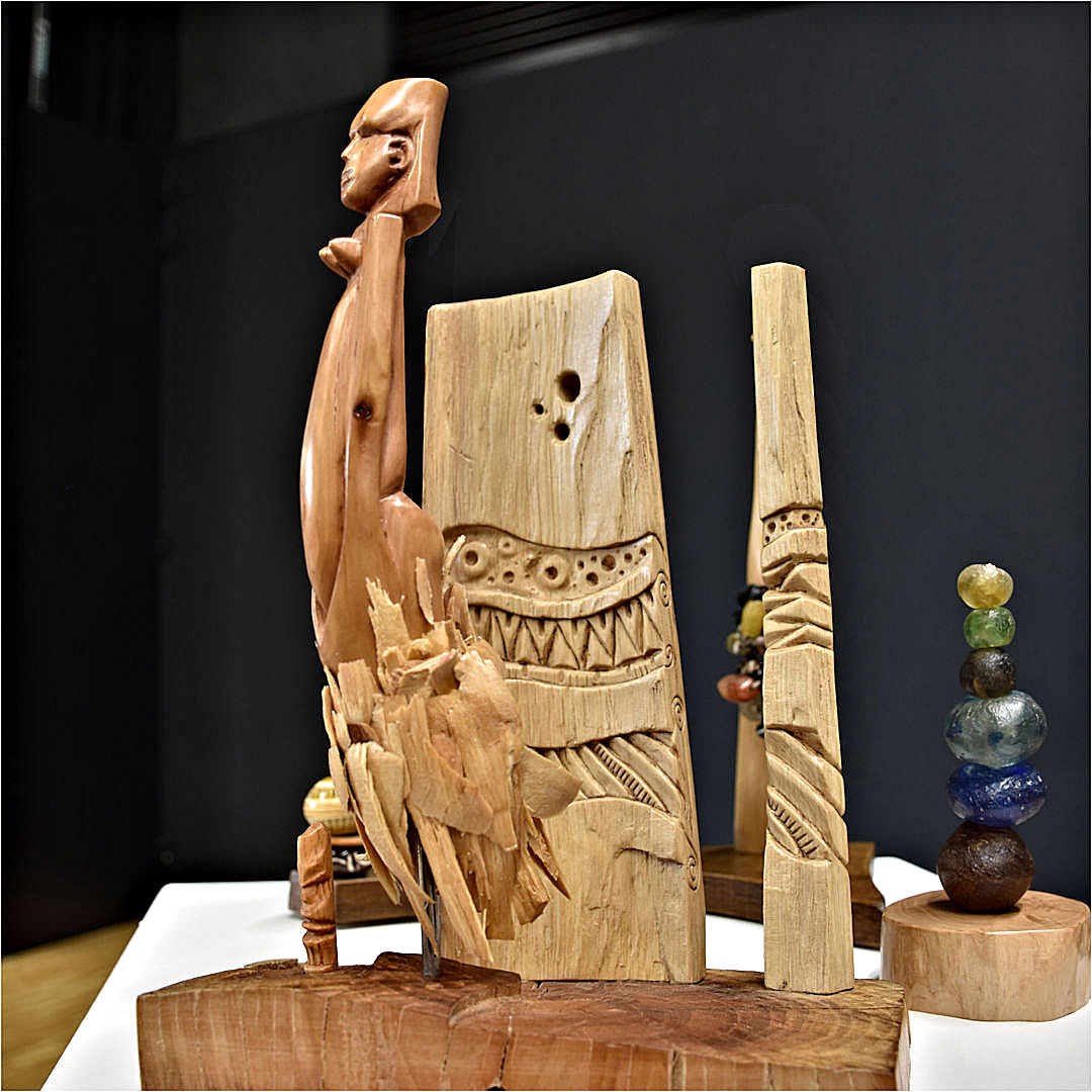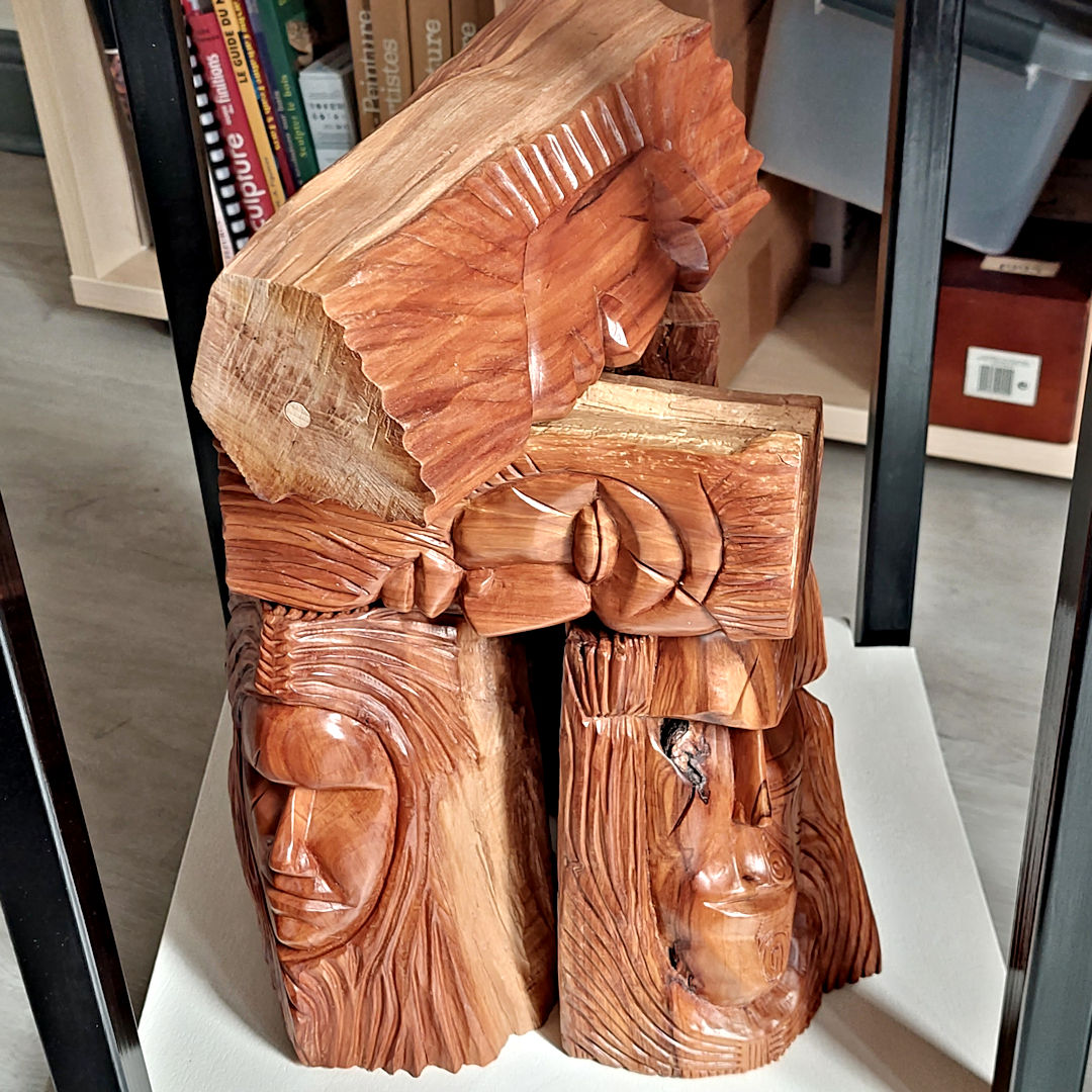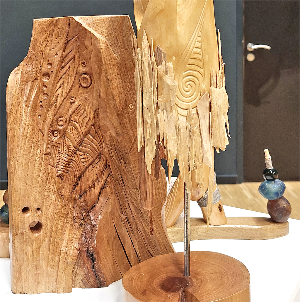 Les autres composantes de l’arbre, tronc, souche et racines, donnerons des concepts aux caractères différents avec soit des visages ou des créatures imaginaires, voire des «faux fossiles »…Dernièrement, j’ai aussi travaillé sur de la sculpture plus intuitive, libre et abstraite ou en frises de motifs. Ces dernières forment déjà de beaux duos avec certaines Vénus…