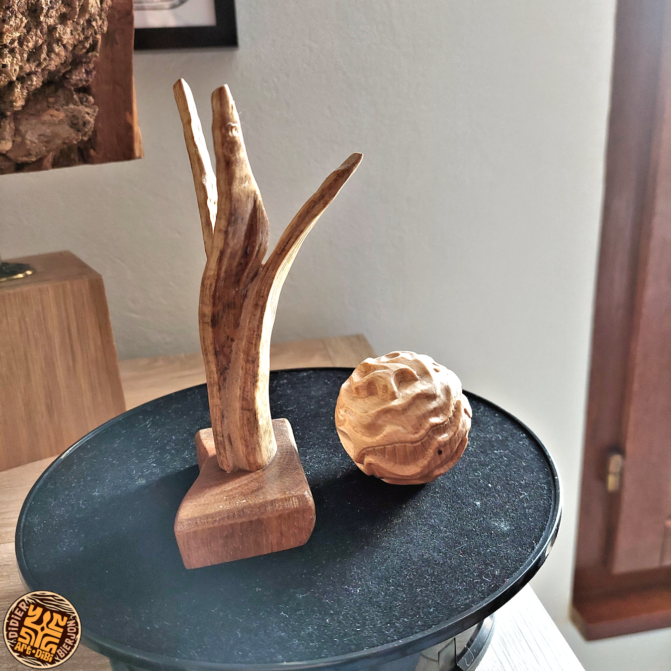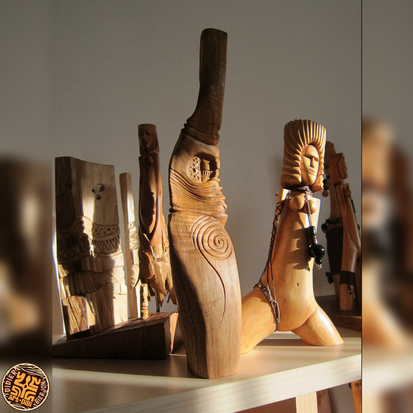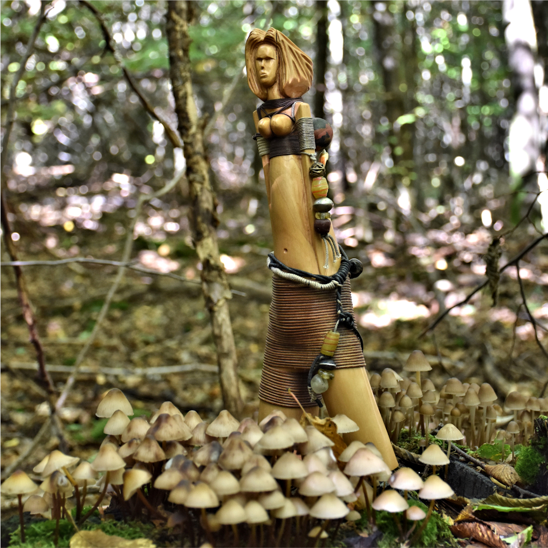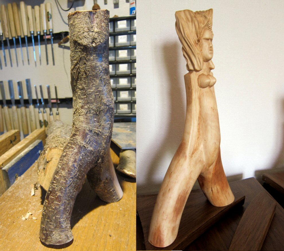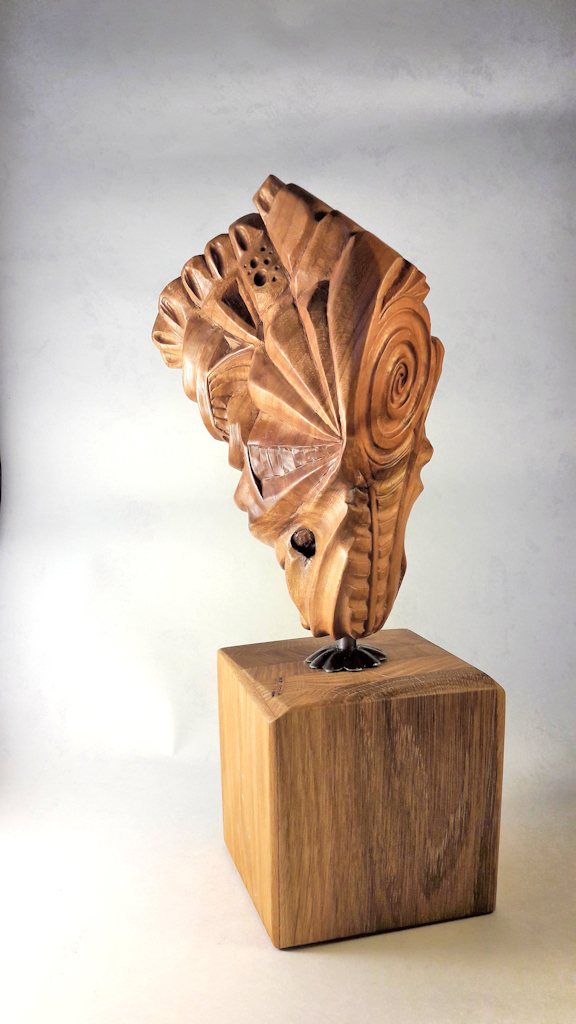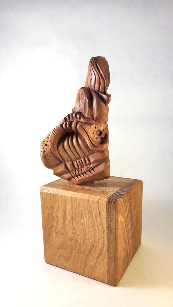 Les autres composantes de l’arbre, tronc, souche et racines, donnerons des concepts aux caractères différents avec soit des visages ou des créatures imaginaires, voire des «faux fossiles »…Dernièrement, j’ai aussi travaillé sur de la sculpture plus intuitive, libre et abstraite ou en frises de motifs. Ces dernières forment déjà de beaux duos avec certaines Vénus…