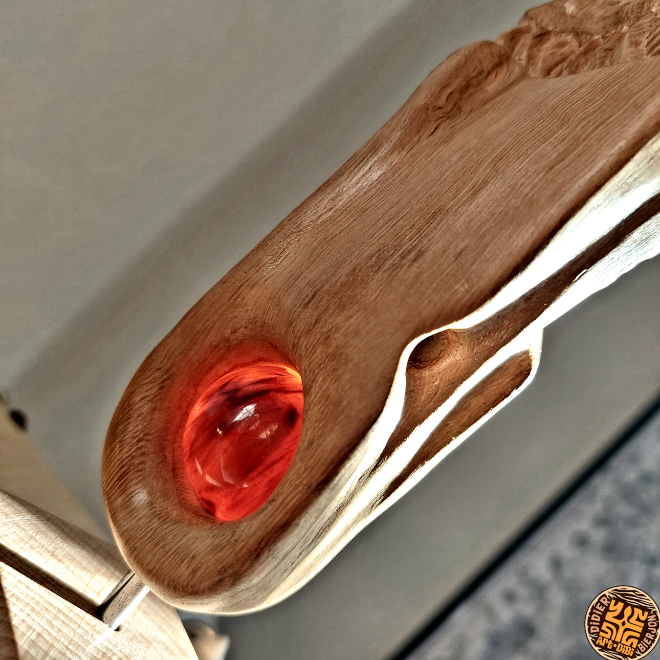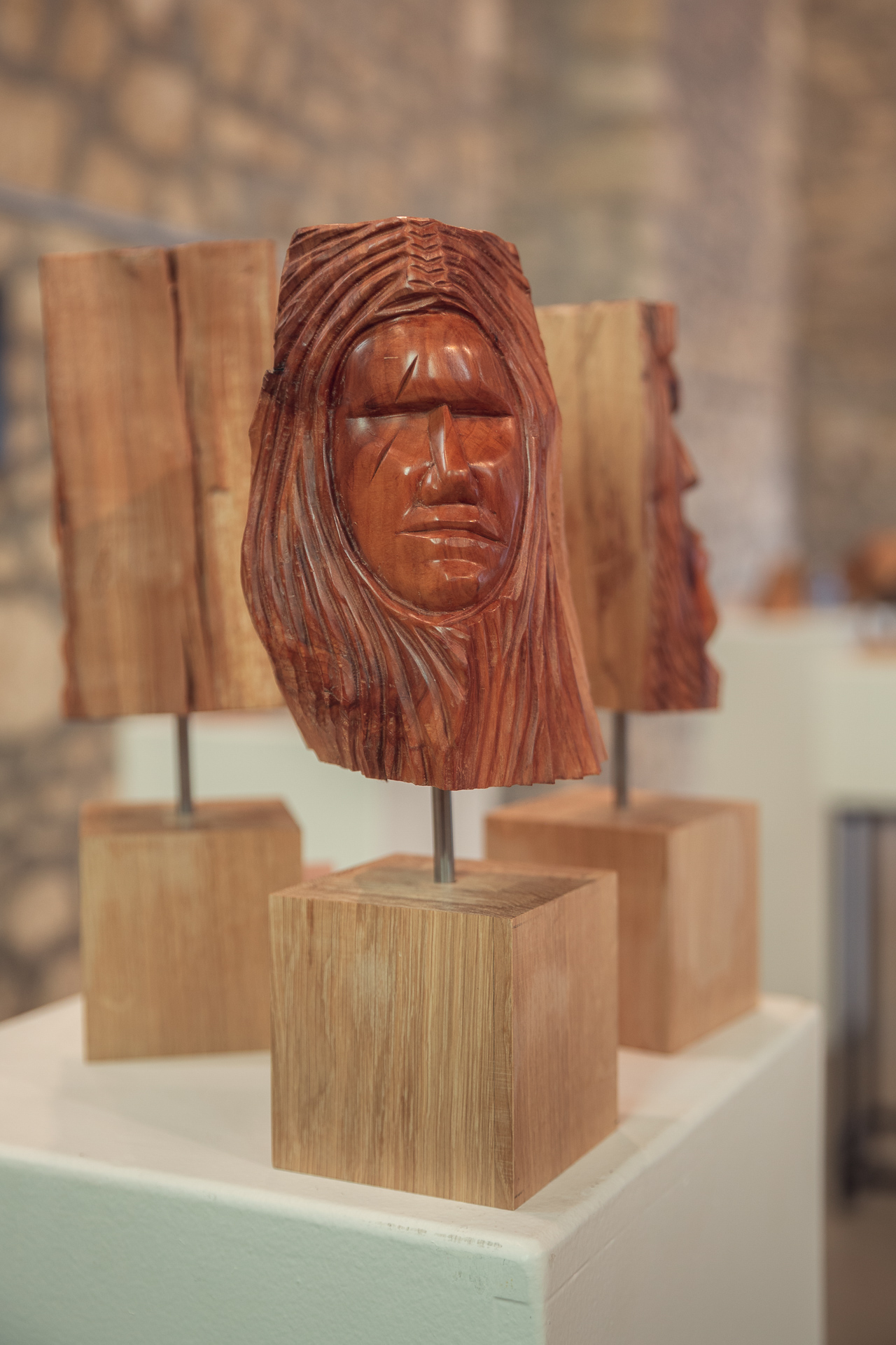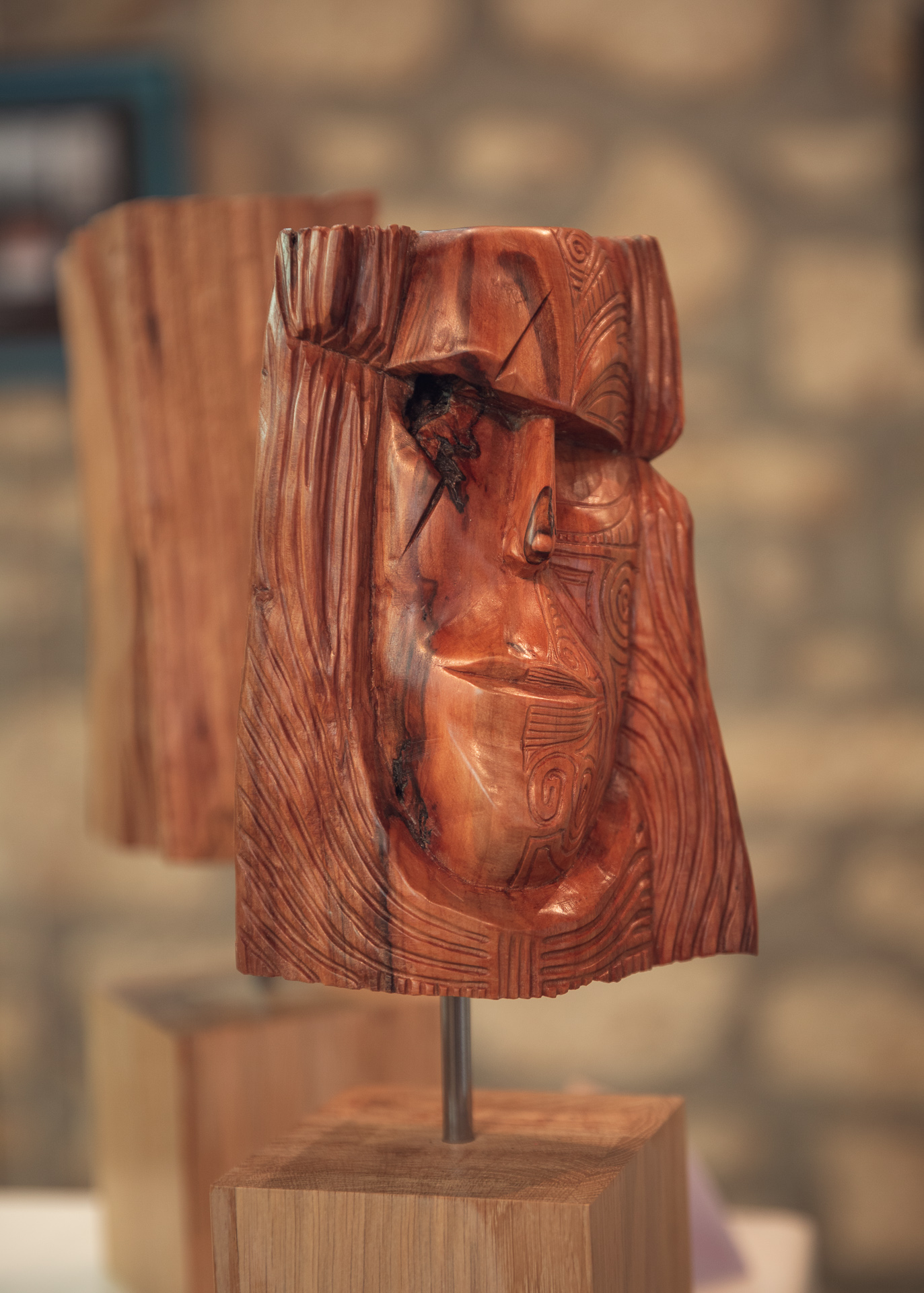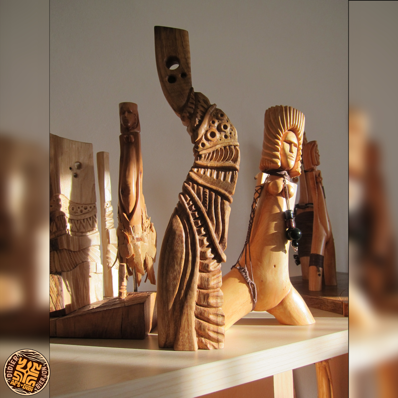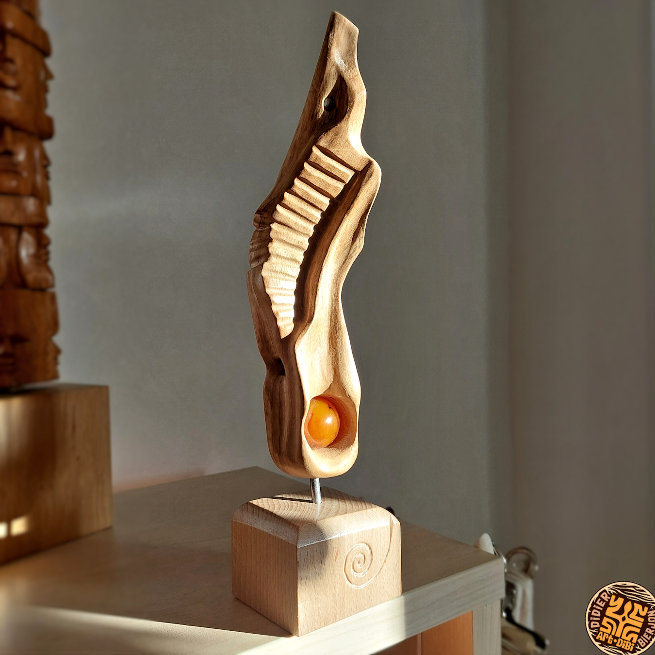 Les autres composantes de l’arbre, tronc, souche et racines, donnerons des concepts aux caractères différents avec soit des visages ou des créatures imaginaires, voire des «faux fossiles »…Dernièrement, j’ai aussi travaillé sur de la sculpture plus intuitive, libre et abstraite ou en frises de motifs. Ces dernières forment déjà de beaux duos avec certaines Vénus…