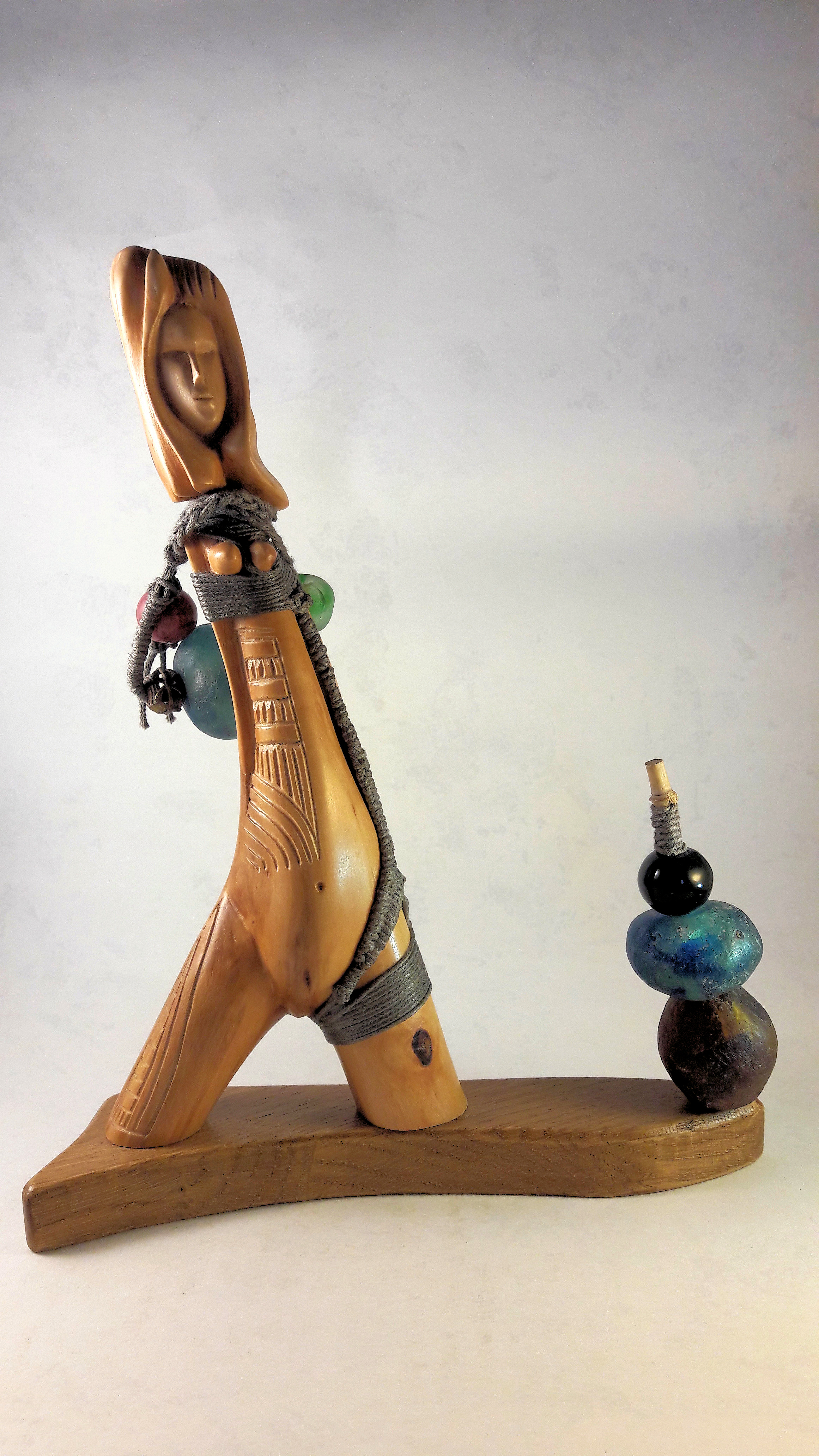 Création iconique de ma démarche de création, la « Vénus » est née d’une simple branche d’arbre avec une forme déjà suggérée par la nature. Cachés dans son volume, je vais aller chercher une attitude, une posture, une émotion, un corps de Vénus…Le concept, comme une civilisation, est en constante évolution et d’autres matières apparaissent: cordage en coton ciré, perles, pâtes de verre du Sénégal, copeaux d’atelier,…